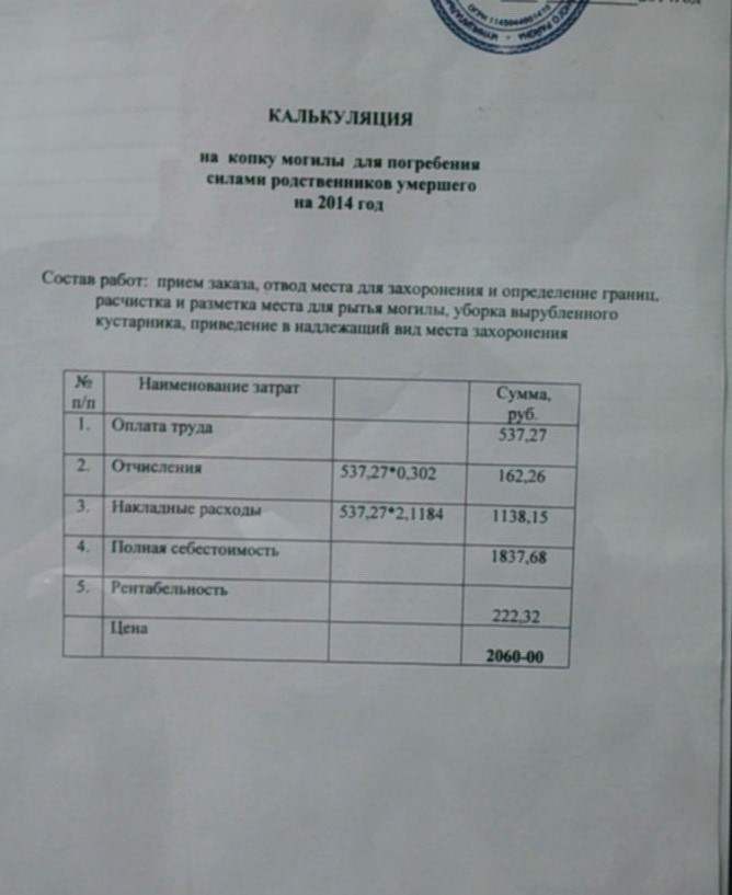 а вот ты не обратил внимание на тот факт, что "на копку могилы для погребения силами родственников умершего", а в калькуляции стоит сумма ЗП 537,27 это кому? это бред. это кому ЗП, родственнику?